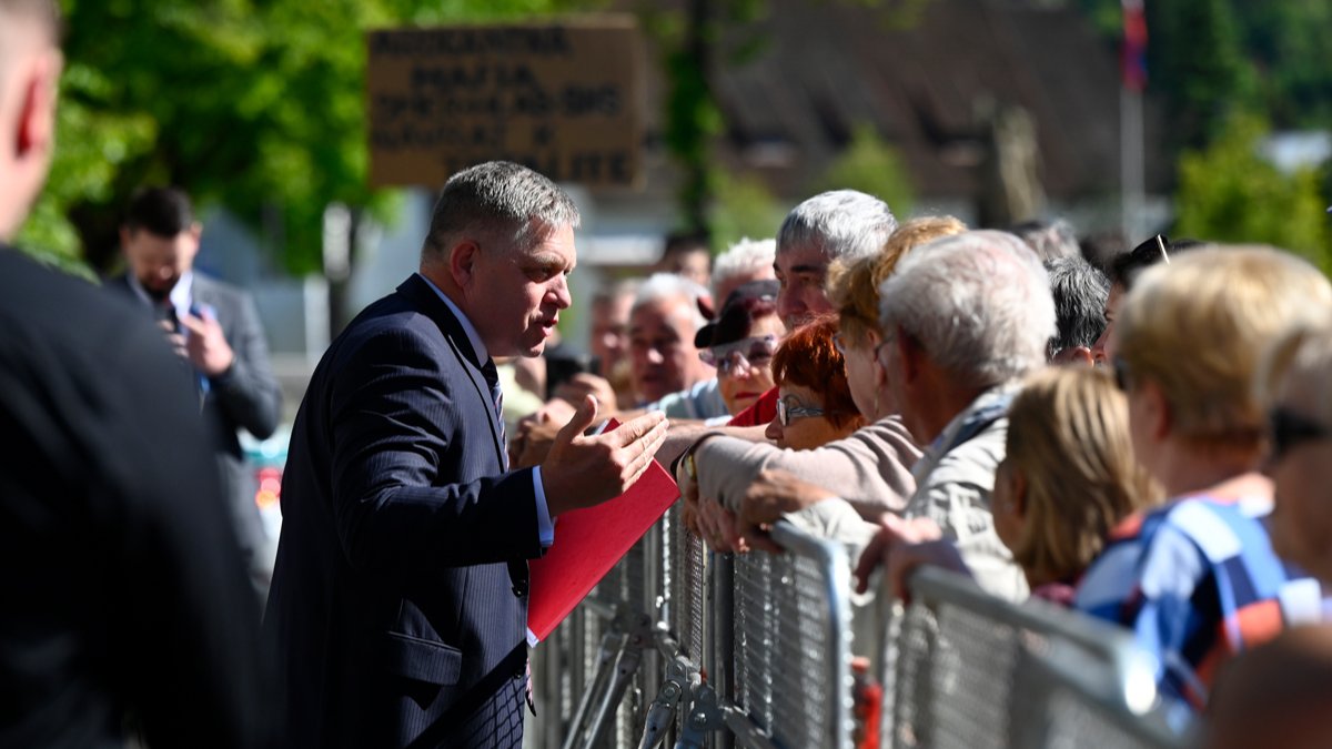 Премьер-министр Словакии Роберт Фико (в центре) общается с местными жителями перед выездным заседанием правительства в городе Хандлова, Словакия, 15 мая 2024 года. Фото: Radovan Stoklasa / TASR / AP / Scanpix