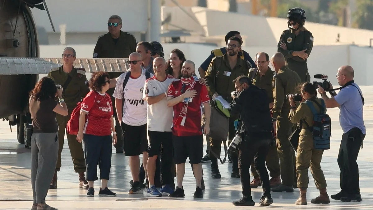 Бывший израильский заложник Эйтан Хорн (в центре) выходит из военного вертолёта на площадке медицинского центра Ихилов в Тель-Авиве, 13 октября 2025 года. Фото: Jack Guez / AFP / Scanpix / LETA