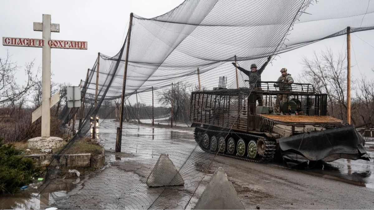 Украинские военные на бронетехнике движутся по дороге, закрытой специальными сетками для защиты от беспилотников, недалеко от прифронтовой Дружковки, Донецкая область, Украина, 14 февраля 2026 года. Фото: Tommaso Fumagalli / EPA