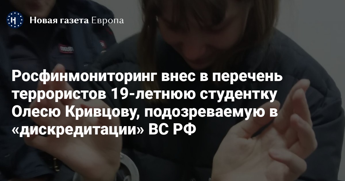 Росфинмониторинг внес в перечень террористов и экстремистов 19-летнюю студентку Олесю Кривцову, подозреваемую в «дискредитации» ВС РФ (ч. 1 ст. 280.3 УК) и публичном оправдании терроризма (ст. 205.2 УК).