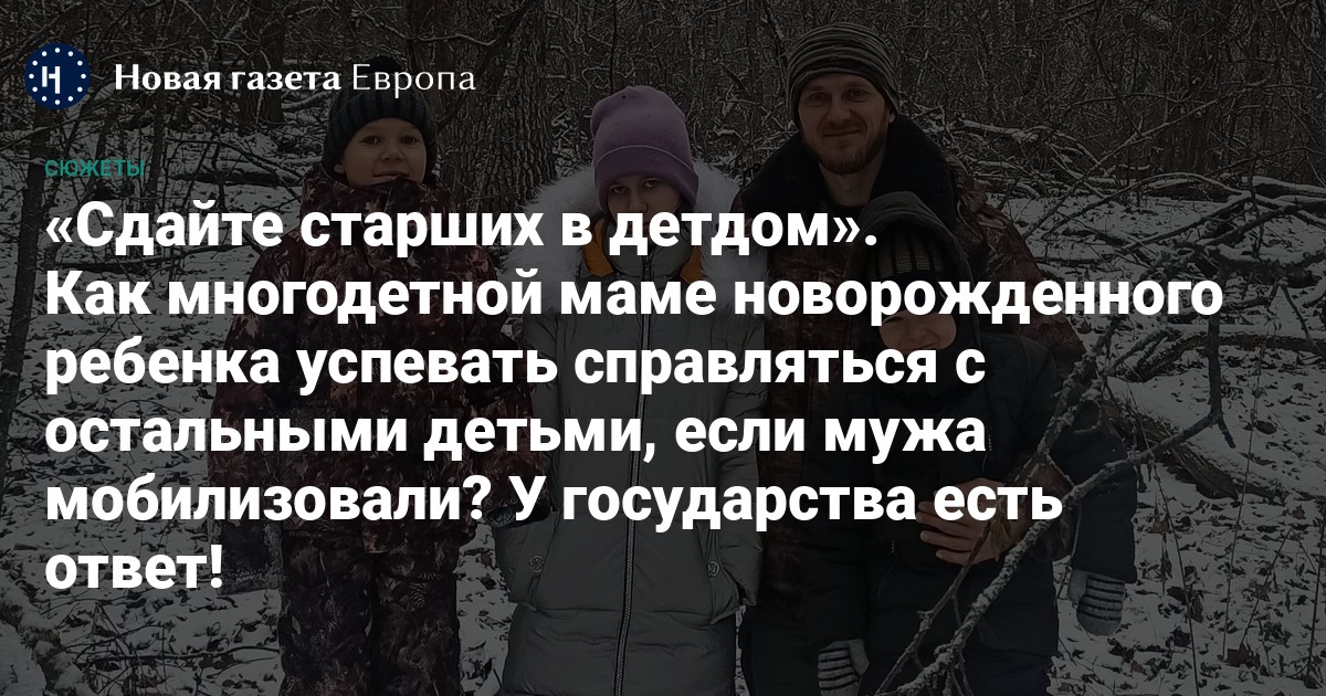 А таких примеров множество. Вот, например, после мобилизации мужа Шамиля Наталья из Нальчика осталась одна с тремя детьми. Военкомат уже семь раз отказал Шамилю в отсрочке, поскольку старшему сыну Шамиля и Натальи Руслану исполнилось шестнадцать лет. По словам женщины, все домашние дела в семье были на муже, в то время как она занималась детьми — старшим Русланом, 11-летним Муслимом и младшей полуторагодовалой дочкой Полиной. Получив повестку, мужчина был уверен, что вернется домой, — ему 44 года. Он ошибся: от посещения военкомата до посадки в автобус прошло всего два часа, которые дали на сборы. Уже пять месяцев мужчина находится на передовой в зоне СВО.