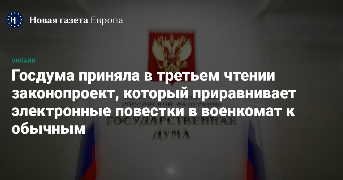 Государственная дума сегодня рассмотрела и приняла сразу в трех чтениях законопроект, который приравнивает электронные повестки к обычным. Текст нововведений был опубликован всего за несколько часов до этого. «Новая газета Европа» собирает самое важное из нового законопроекта.