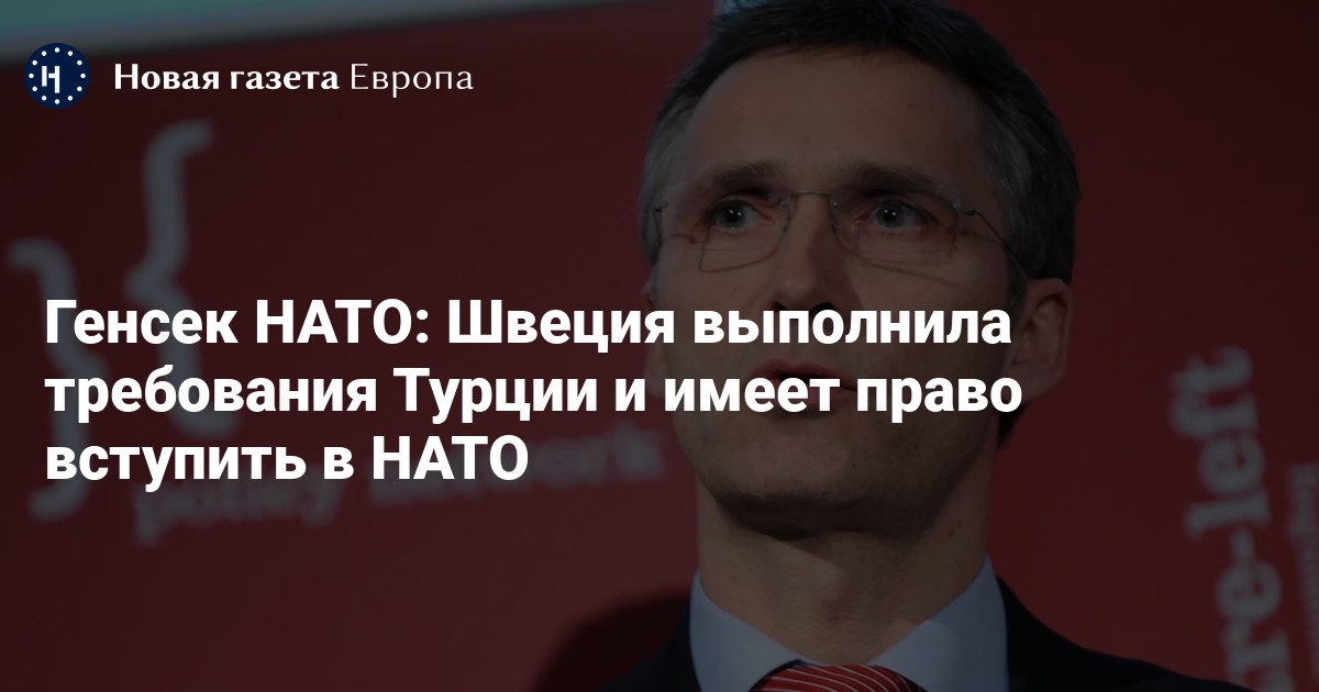 Генеральный секретарь НАТО Йенс Столтенберг заявил, что Швеция выполнила требования Турции в рамках трехстороннего меморандума и имеет право на вступление в НАТО. Об этом сообщает ТАСС.