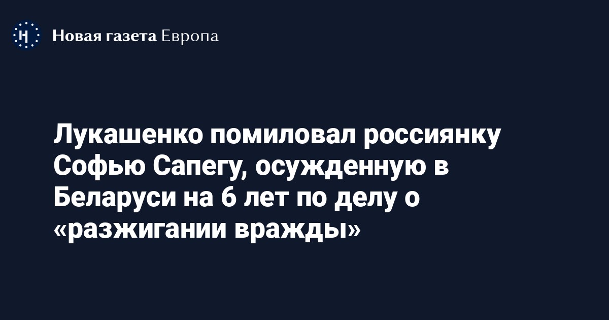 Лукашенко помиловал россиянку Софью Сапегу, осужденную в Беларуси на шесть лет колонии лет по делу о «разжигании вражды». Об этом сообщает БелТА.