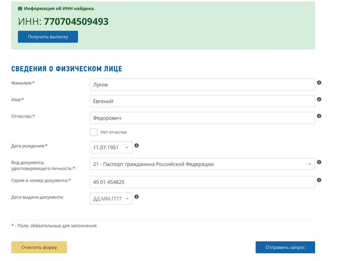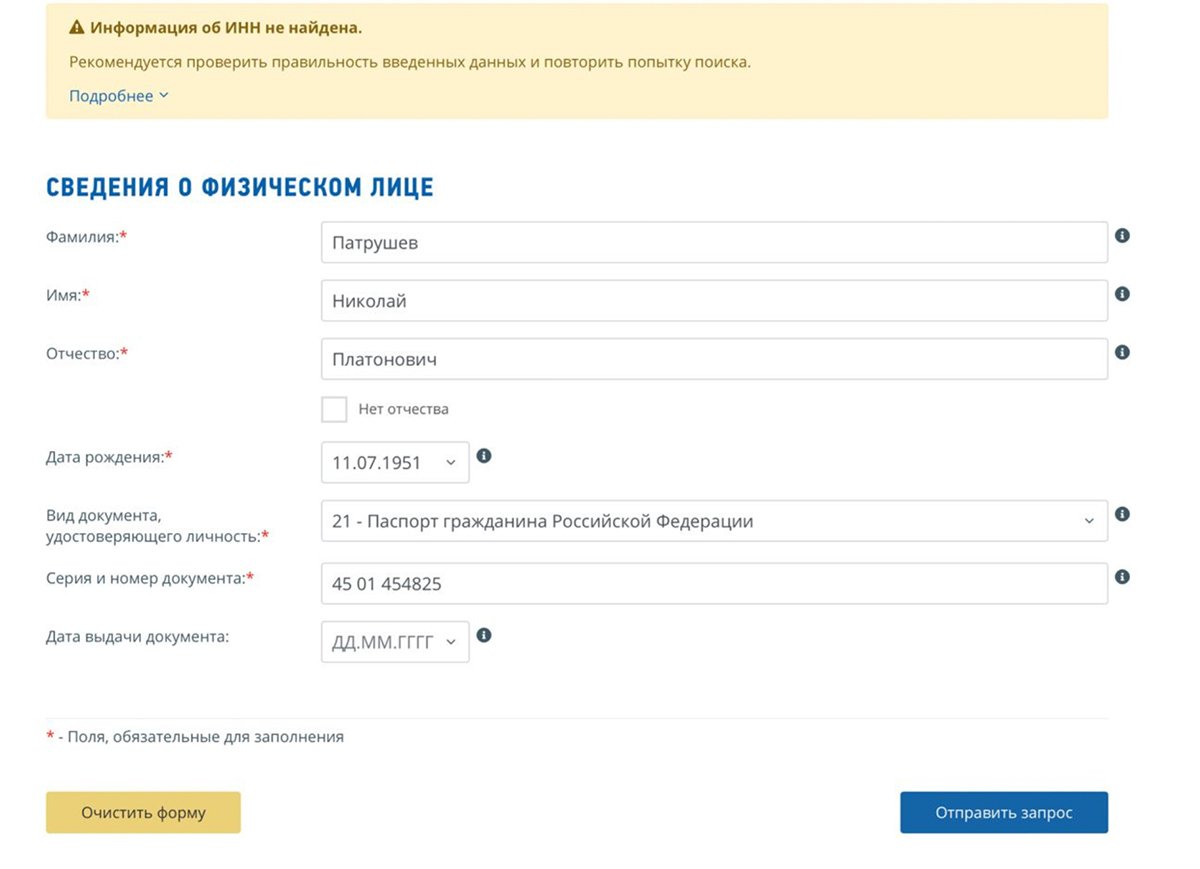 Как выяснил «Можем объяснить», в базе ФНС Патрушев скрыт под псевдонимом — Луков Евгений Фёдорович. Дата его рождения, номера паспорта и ИНН полностью совпадают с данными секретаря российского Совбеза. ИНН — один на всю жизнь, не меняется даже в случае полной смены прочих персональных данных.