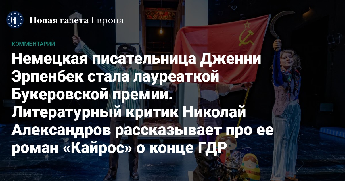 21 мая в Лондоне огласили очередного победителя: жюри признало лучшим роман «Кайрос» немецкой писательницы Дженни Эрпенбек, переведенный Михаэлем Хоффманом. Это книга о крахе ГДР — действие, которое по жанру можно определить как «историю отношений» между девятнадцатилетней Катариной и пятидесятилетним Гансом (некогда фашистом, а позже — пламенным коммунистом), что происходит в Восточном Берлине на фоне падения Стены. «Новая газета Европа» попросила литературного критика Николая Александрова рассказать об этом романе и о писательнице, которой уже прочат Нобелевскую премию.