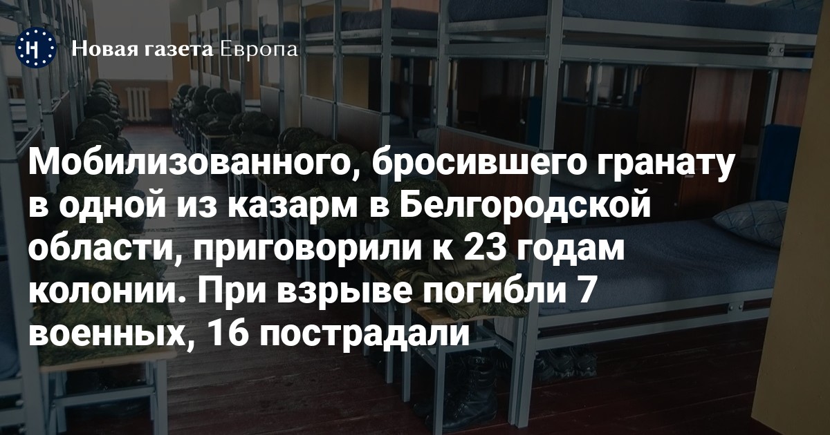 2-й Западный окружной военный суд приговорил к 23 годам колонии мобилизованного из Свердловской области Дмитрия Лобовикова, бросившего гранату в одну из казарм в Белгородской области и убившего тем самым семерых сослуживцев. Об этом сообщают ТАСС и РБК со ссылкой на пресс-службу суда.