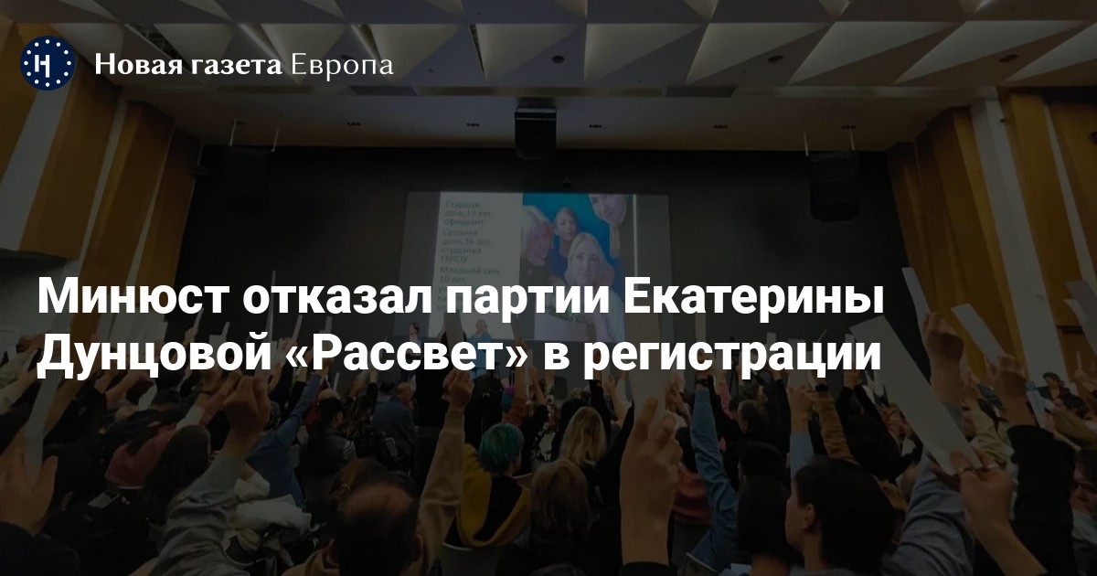 Минюст России отказал в регистрации политической партии Екатерины Дунцовой «Рассвет». Об этом «Новой-Европа» рассказал член Центрального совета партии.