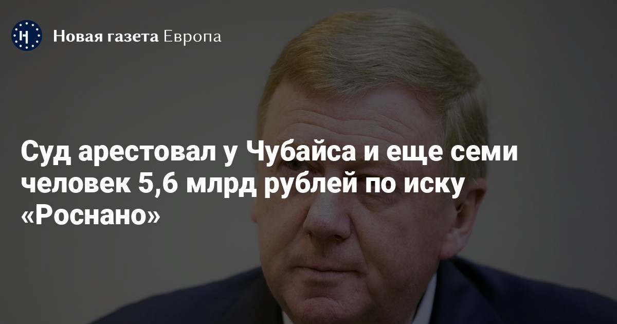 Арбитражный суд Москвы наложил арест на деньги и имущество Анатолия Чубайса и еще семи ответчиков в размере 5,6 млрд рублей по иску компании «Роснано». Об этом пишет РБК.