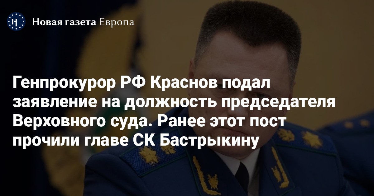 Генеральный прокурор России Игорь Краснов подал заявление на должность председателя Верховного суда. Об этом пишет ТАСС со ссылкой на заявление главы Высшей квалификационной коллегии судей РФ Николая Тимошина.