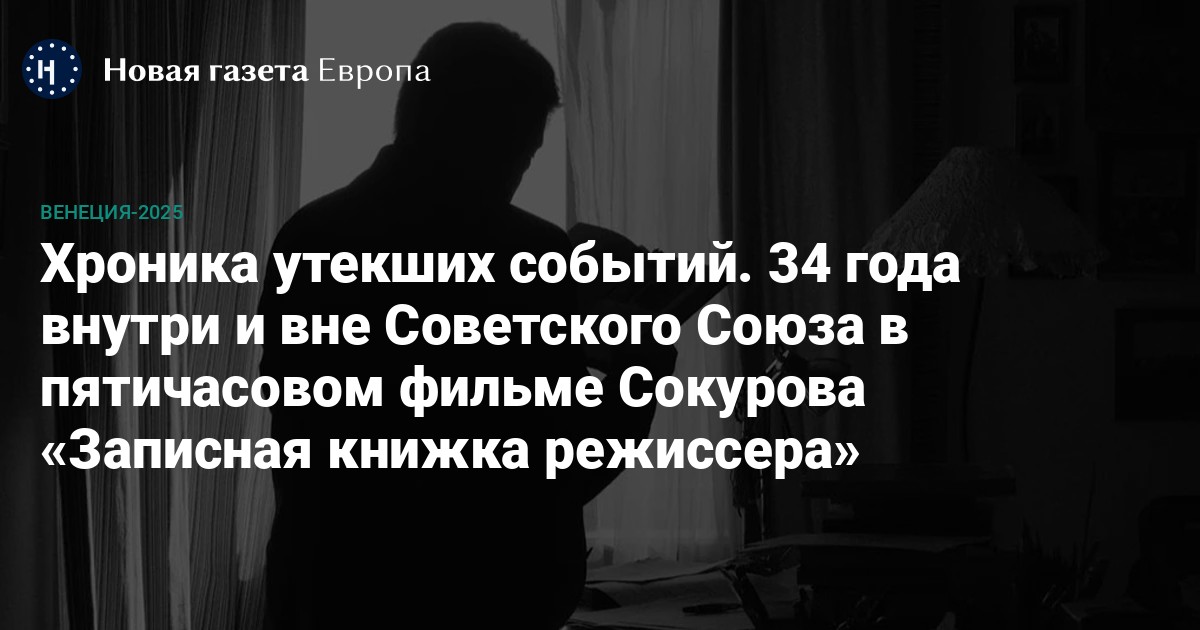 Вне основного конкурса на Венецианском кинофестивале-2025 показали новый документальный фильм Александра Сокурова «Записная книжка режиссера». Он идет пять часов с 15-минутным антрактом и состоит из советской хроники, архивных съемок, фрагментов телефильмов и телепередач с 1957 по 1991 год.