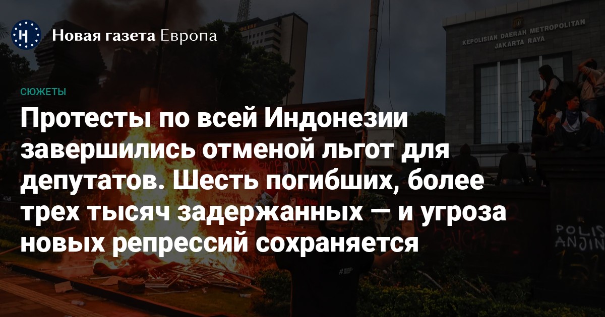 Масштабные протесты, охватившие Индонезию в конце августа, привели к гибели шести человек, арестам более трех тысяч протестующих и поджогам правительственных зданий. Причиной возмущения стало введение для депутатов парламента ежемесячного жилищного пособия в размере 3000 долларов США, которое в десятки раз превышает доходы обычных граждан.