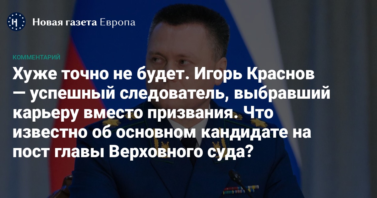 Его дальнейший карьерный рост происходил уже без меня. Обсуждать сегодняшнего Краснова я могу только как сторонний наблюдатель. Не буду комментировать причины, по которым его выдвинули на должность председателя Верховного Суда. Но, понятно, самостоятельно такое решение Игорь Краснов принять не мог. В то же время считаю, что приход в судебную систему (которая находится в глубочайшем упадке и нуждается в реформировании) человека из другой структуры — явление, безусловно, положительное».