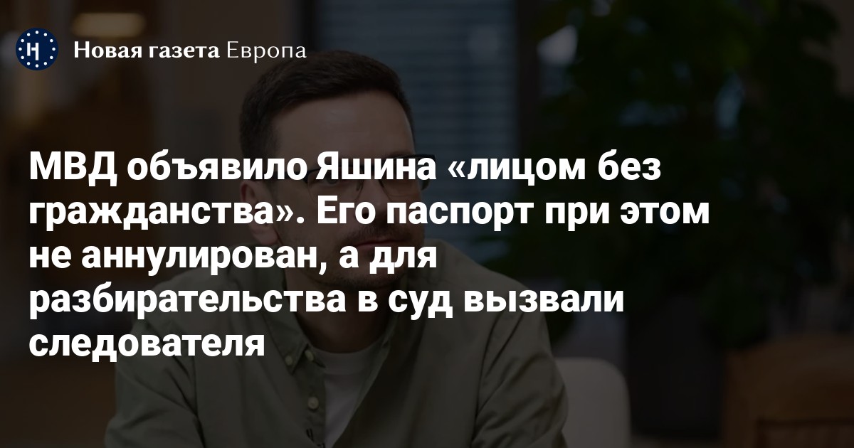 Как выяснило «Агентство», российский паспорт Яшина не аннулирован, несмотря на статус «лица без гражданства» в справке от МВД. Издание нашло номер российского паспорта Яшина в утечках и политик подтвердил журналистам, что это именно он. Согласно сервису проверки действительности документа на портале «Госуслуги», этот паспорт числится действительным.