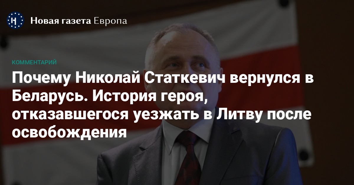 Николай Статкевич всегда говорил, что не уедет. И когда его освобождали в 2015 году, он, едва приехав на минский вокзал из колонии, сказал минчанам, пришедшим его встречать: «Я никуда не уеду. Мы сделаем эту страну нормальной и свободной». А когда его спросили, собирается ли он возвращаться в политику, Николай ответил: «Я бы не назвал то, что происходит, политикой. Я возвращаюсь в борьбу». Так стоит ли удивляться тому, что Николай, по свидетельству других бывших политзеков, на нейтральной территории просто выбил дверь автобуса и вышел, чтобы не оказаться в Литве, а вернуться в Беларусь.
