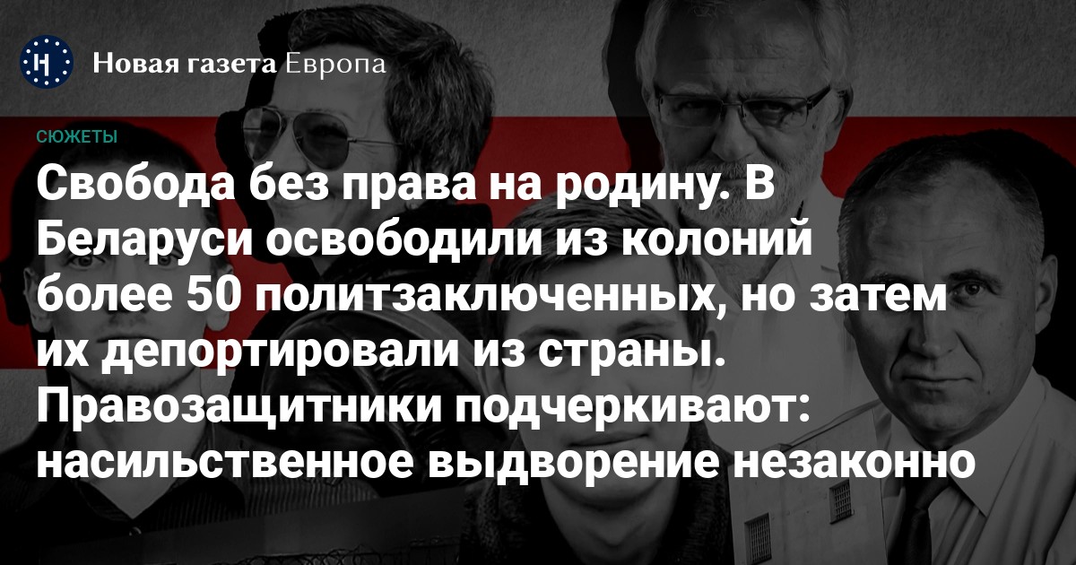 «Людей выдворяют из страны против их воли — не имеют права. Нет такого закона», — так комментируют правозащитники выдворение из Беларуси более 50 освобожденных политзаключенных. Среди них — журналисты, активисты и граждане, протестовавшие летом 2020 года против итогов президентских выборов, по результатам которых победителем объявили Александра Лукашенко. Массовое освобождение, ставшее результатом переговоров с США, стало насильственным изгнанием, противоречащим Конституции и международным нормам.