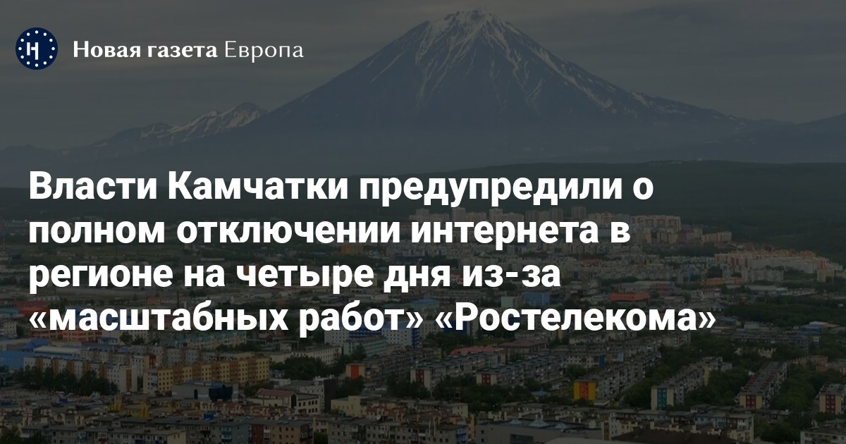 Власти Камчатского края предупредили о полном отключении интернета в регионе из-за «масштабных работ» «Ростелекома», которые запланированы на период с 25 по 29 сентября.