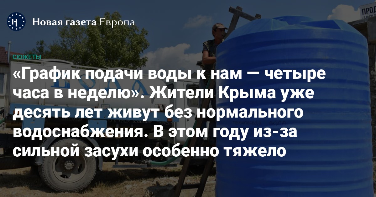 Иногда воды в ее поселке, как и во многих других населенных пунктах Крыма, нет дольше двух или трех суток. В некоторые села подвозят техническую воду — она очищена хуже, чем питьевая, поэтому ее нельзя использовать для готовки и питья. Но и здесь планировать сложно: подвоз не всегда регулярный. ГУП РК «Вода Крыма» — компания, которая занимается водоснабжением полуострова, — регулярно получает гневные сообщения от жителей.