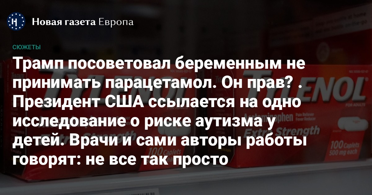 «Не принимайте “Тайленол” (торговое название парацетамола в США. — Прим. ред.), — рекомендовал Трамп беременным женщинам на пресс-конференции в понедельник. — Тут нет минусов. Не принимайте его. Вам будет некомфортно. Возможно, вам будет нелегко. Но не принимайте его, если вы беременны».
