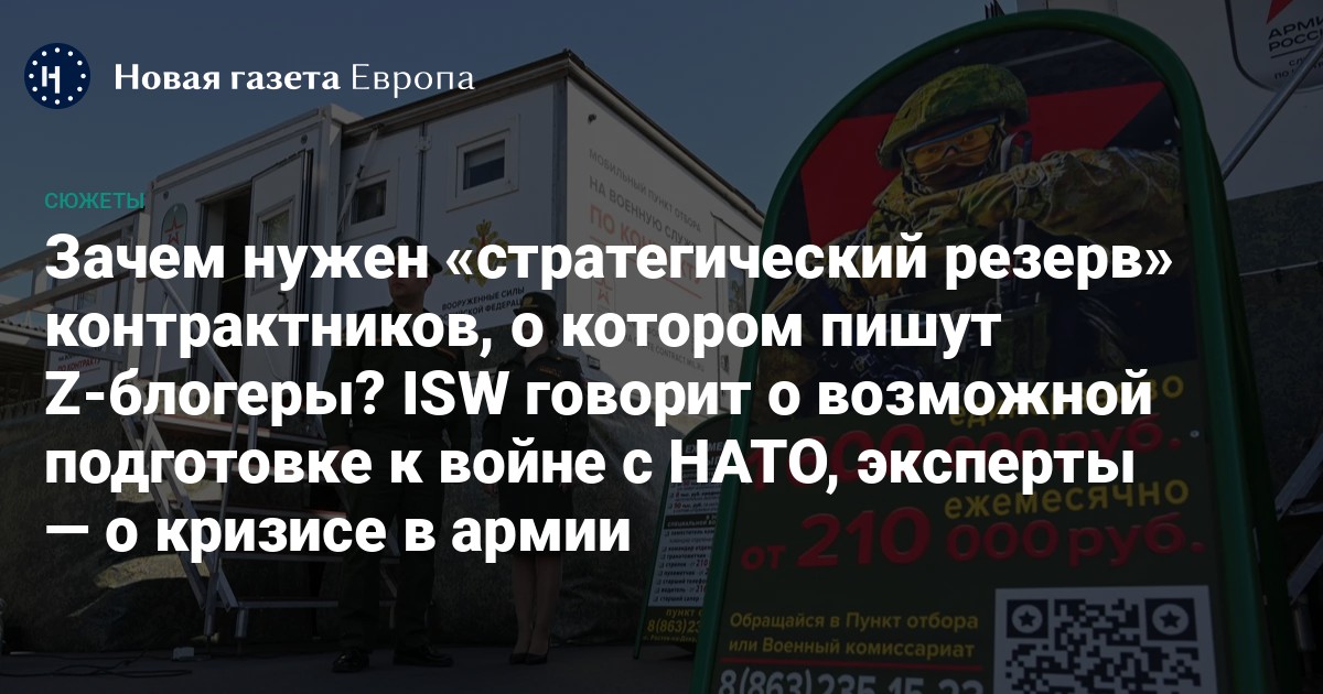«В целом в озвученных данных по набору контрактников ничего нового нет, — рассказывает “Новой-Европа” военный обозреватель Давид Шарп. — И раньше было известно о том, что примерно 1 тысяча человек подписывает контракт каждые сутки. Это даже ниже темпов 2024 года. Источники ТГ-канала “Дети Арбата”, на которые ссылаются журналисты, не называют пропорции, в которой часть контрактников из общего числа записавшихся на службу пойдет в резерв. Российская армия, очевидно, испытывает сейчас трудности с количеством личного состава. Не случайно в боевых действиях участвуют иностранные наемники, которым за это платят огромные деньги. Естественно, что резервы создаются.