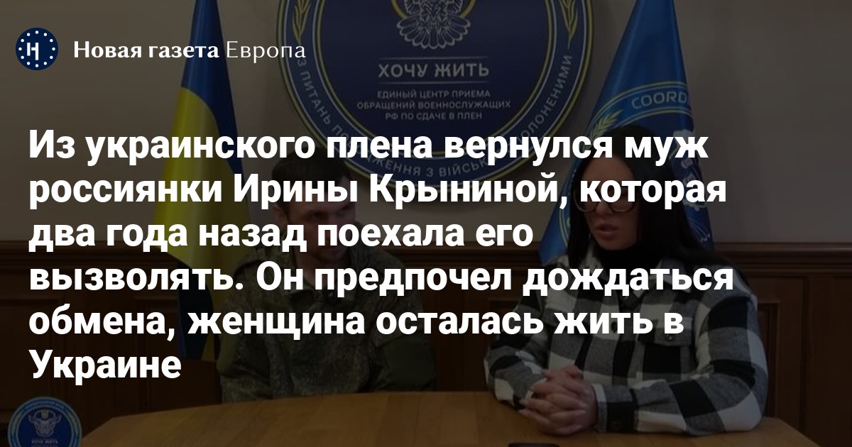 Из украинского плена вернулся муж россиянки Ирины Крыниной, которая два года назад поехала его вызволять. Он предпочел дождаться обмена, женщина осталась жить в Украине
