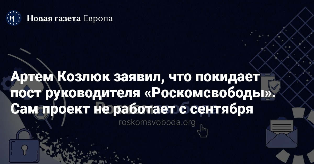 Артем Козлюк заявил, что покидает пост руководителя «Роскомсвободы». Сам проект не работает с сентября