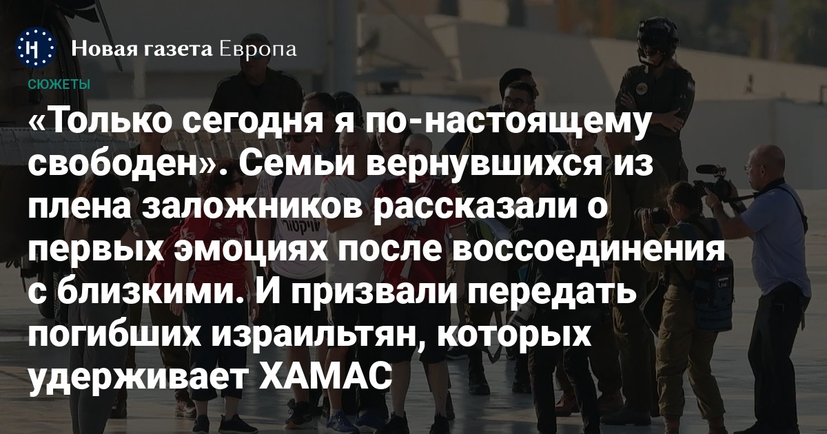 После двух лет ужаса и неопределенности родственники вернувшихся из сектора Газа израильских заложников выступили перед журналистами в больницах, где их близкие проходят первые обследования. ХАМАС отпустил заложников 13 октября в рамках первого этапа соглашения, предложенного президентом США Дональдом Трампом, и заключенного при посредничестве Египта, Катара и других стран. Согласно договору, из сектора Газа должны передать тела всех погибших заложников. Сделка также включает временное прекращение огня и частичный отход израильской армии к согласованным линиям дислокации в анклаве. Заявления семей бывших заложников — в материале «Новой газеты Европа».