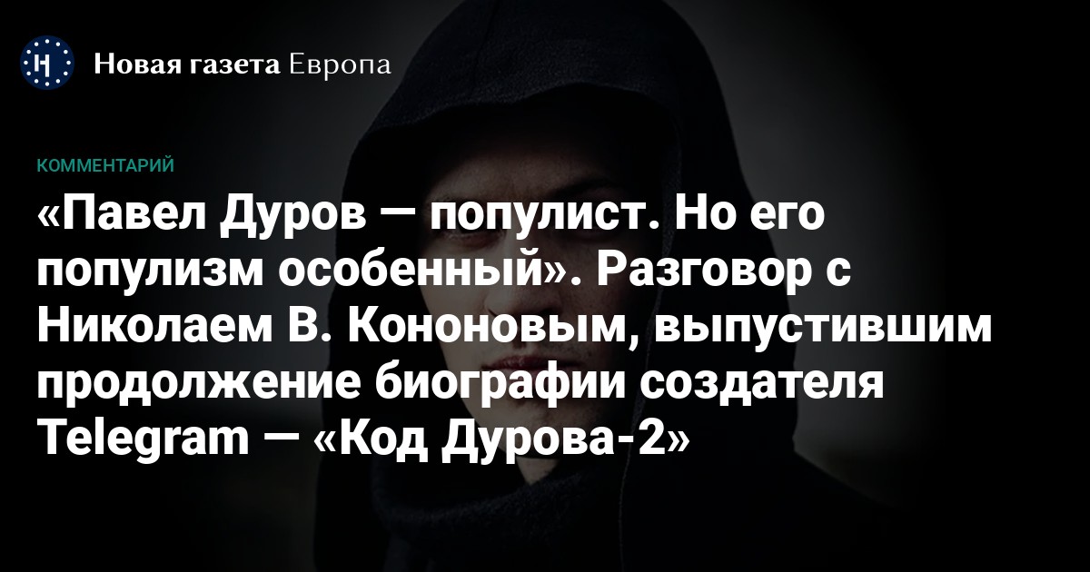 На рубеже 2025–2026 годов писатель Николай В. Кононов выпустил сразу две биографии Павла Дурова, о котором уже писал в 2012-м. Теперь на русском вышел сиквел — «Код Дурова-2», а на английском — The Populist, обобщающий первую книгу и включающий вторую целиком. На фоне усиления блокировки Telegram в России Сорин Брут поговорил с писателем о личности и мотивациях Дурова, переменах в его мировоззрении, а также о правом повороте и закате технооптимизма.