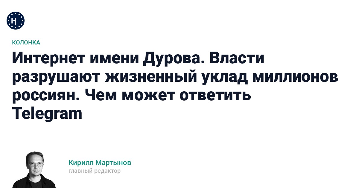 Деталь из публикации Рустамовой: чиновники, далекие от технологий, предпочитают верить таланту Павла Дурова, который что-нибудь придумает снова, как придумал Telegram после «ВКонтакте» и способы обойти первую версию цензуры Роскомнадзора во время блокировок мессенджера в 2018 году. Рано пока хоронить проект Дурова, надеются сами российские чиновники, в чьих интересах как будто бы и уничтожают сейчас Рунет.
