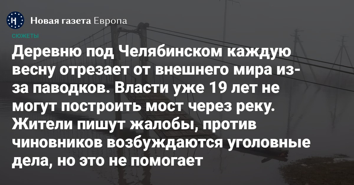 В Челябинской области уже 19 лет не могут построить мост через реку Увельку в деревне Попово. Каждую весну паводок отрезает более 600 жителей от внешнего мира: скорая и пожарные не могут проехать, продукты в магазины доставляют с риском для жизни, а людям приходится перебираться на другой берег по ветхому подвесному мосту 1970-х годов или по опасному бетонному долгострою.