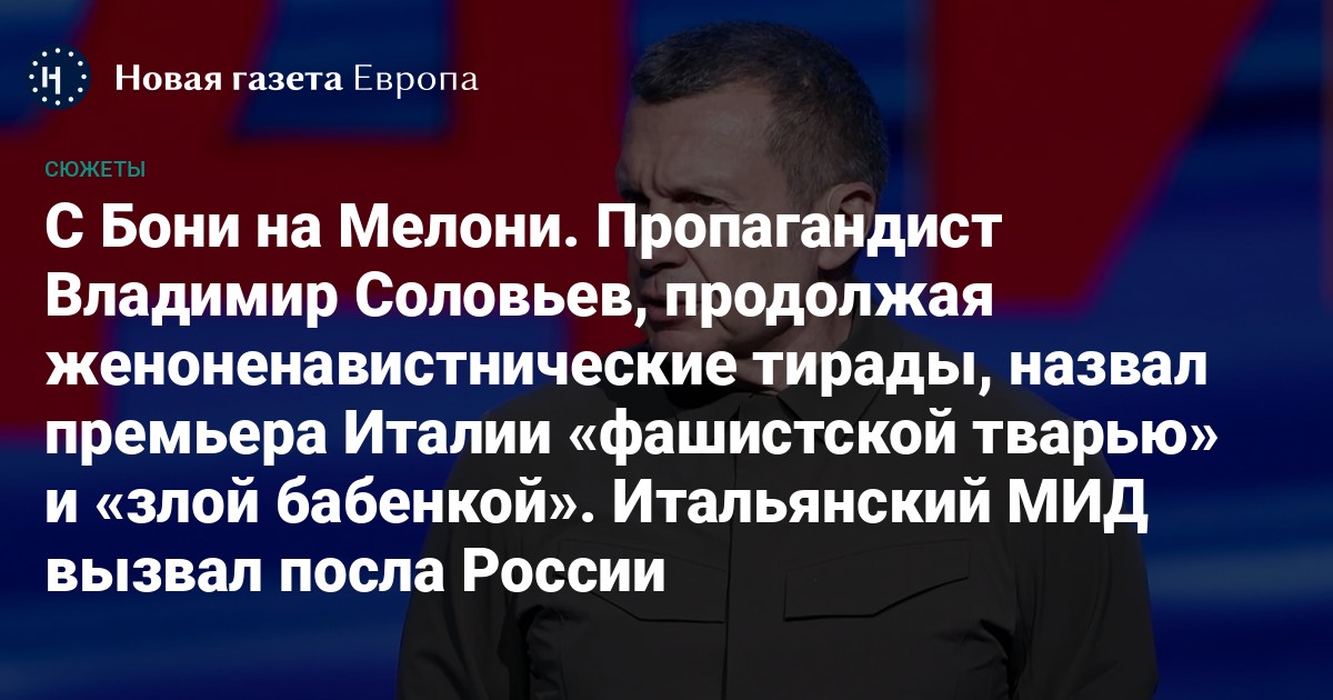Пропагандист Владимир Соловьев в своей программе «Полный контакт» от 16 апреля обрушился с оскорблениями на премьер-министра Италии Джорджию Мелони. На итальянском языке он назвал ее «патентованной идиоткой, злой бабенкой, позором человеческой расы» и «Джорджией ШлюхойМелони», а также обвинил в фашизме, предательстве итальянских избирателей и американского президента Дональда Трампа.