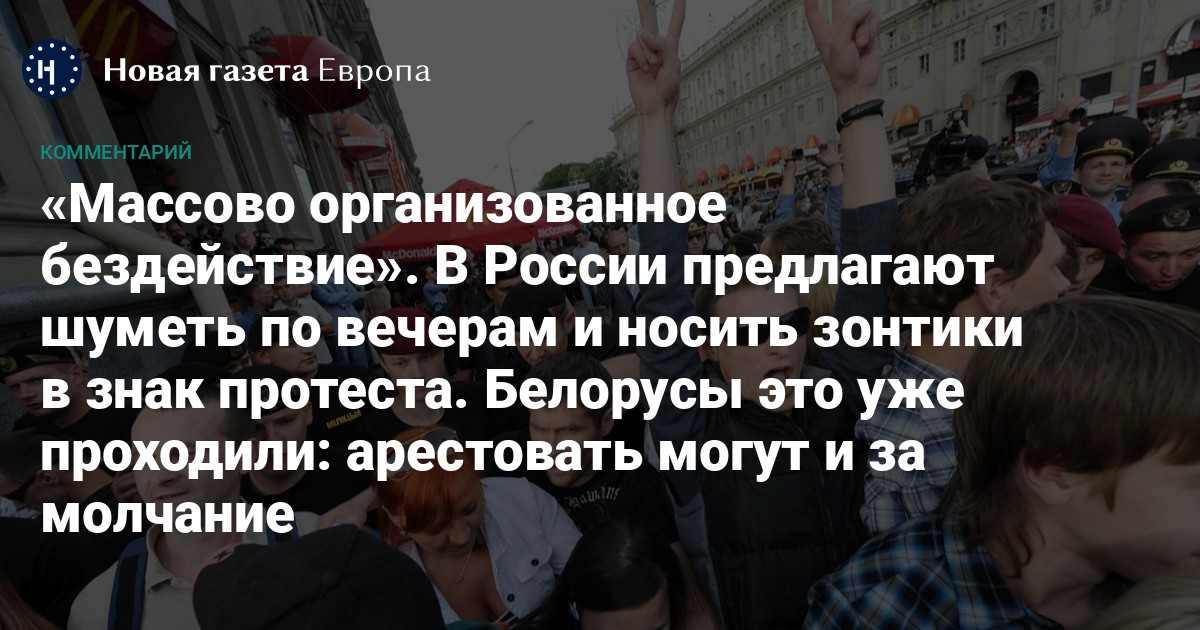 Во время волны репрессий 2010–2011 года в Беларуси придумали хитроумный флешмоб — молчаливые акции. Суть в том, что в определенное время вечером по средам жители городов выходили на центральные улицы и молчали. Или аплодировали. Без лозунгов, кричалок, флагов — просто вечерняя прогулка горожан. К чему тут придраться?